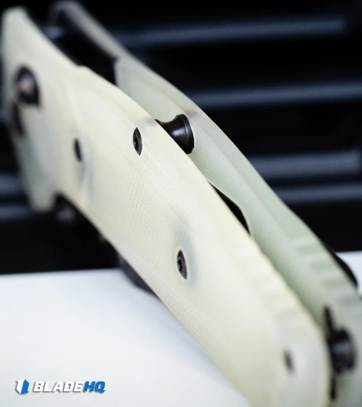 - Handle: Jade G-10 handle is translucent, showing off the inner workings.