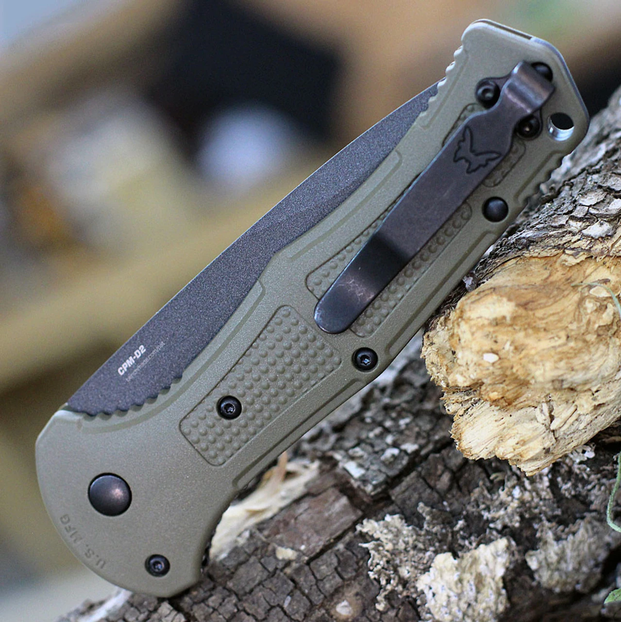 Benchmade Claymore Automatic (9070BK-1) – 3.60″ CPM D2 Black Drop Point Plain Edge, Green Grivory Handle